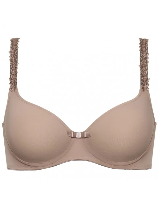 De Dacapo Chanson voorgevormde BH is in deze kleur terra, onzichtbaar onder je witte of lichtkleurige bloes of jurk.