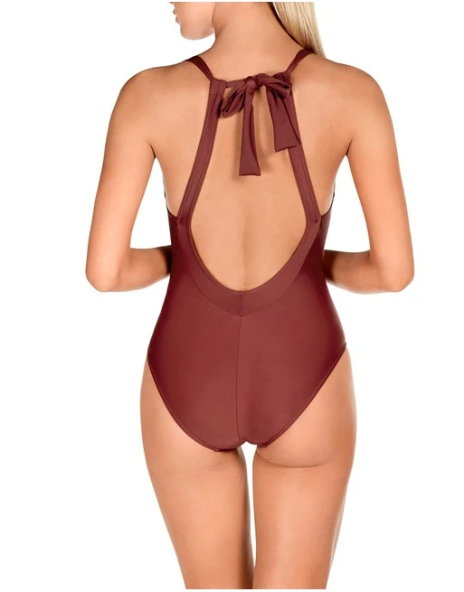 Dit Dolores Cortés badpak, uitgevoerd in lurex materiaal heeft een lage rug uitsnijding en wordt gestrikt in de nek.