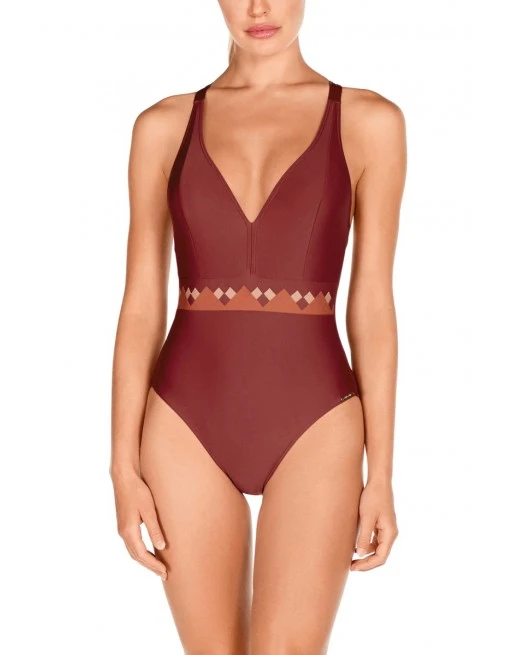 - Effen badpak met een geometrische print als blikvanger.