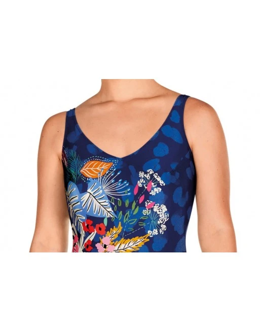 Dit badpak van Dolores Cortés, uitgevoerd in een fleurige multiprint op een klassiek blauwe achtergrond