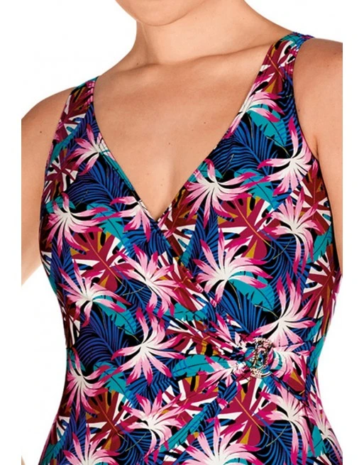 Dit badpak van Dolores Cortés, uitgevoerd in een fleurige multi print met als blikvanger de sierspeld op de drapage.