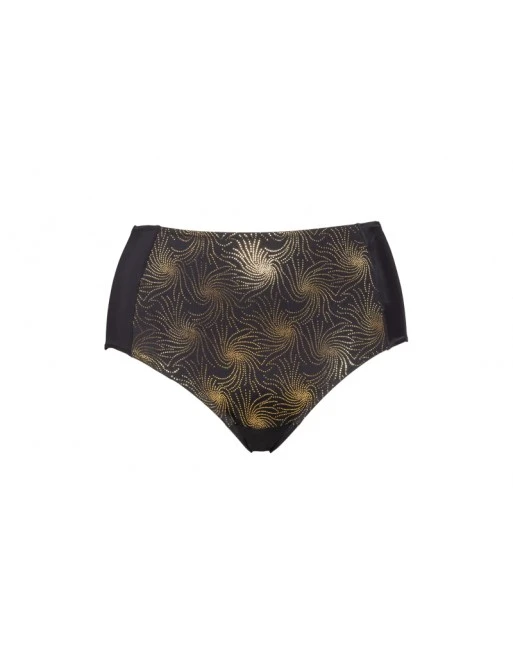 De Plaisir Golden bikini slip hoge taille heeft een goudkleurige lurex print op een zwarte basis.